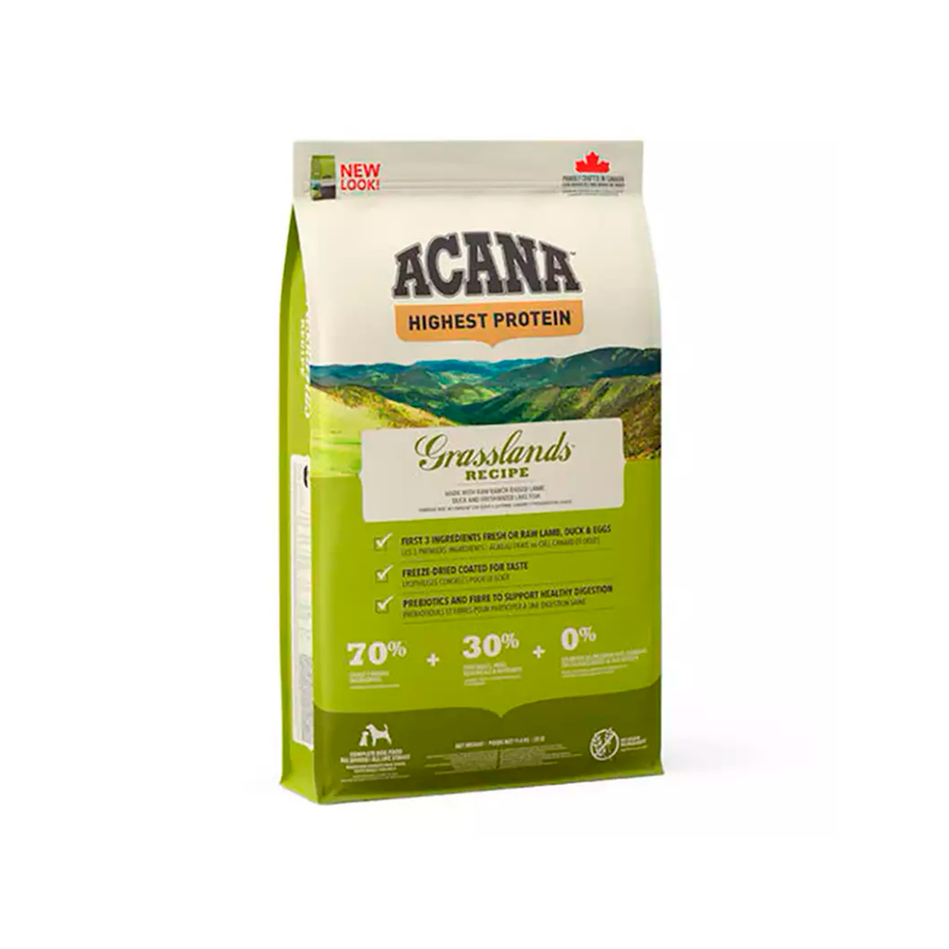 Reflejando la calidad de las tiendas tierras fértiles de Alberta, ACANA Grasslands está cargado de cordero local, huevos enteros, pescado capturado en estado salvaje y pato criado sin jaulas todos entregados frescos cada día.