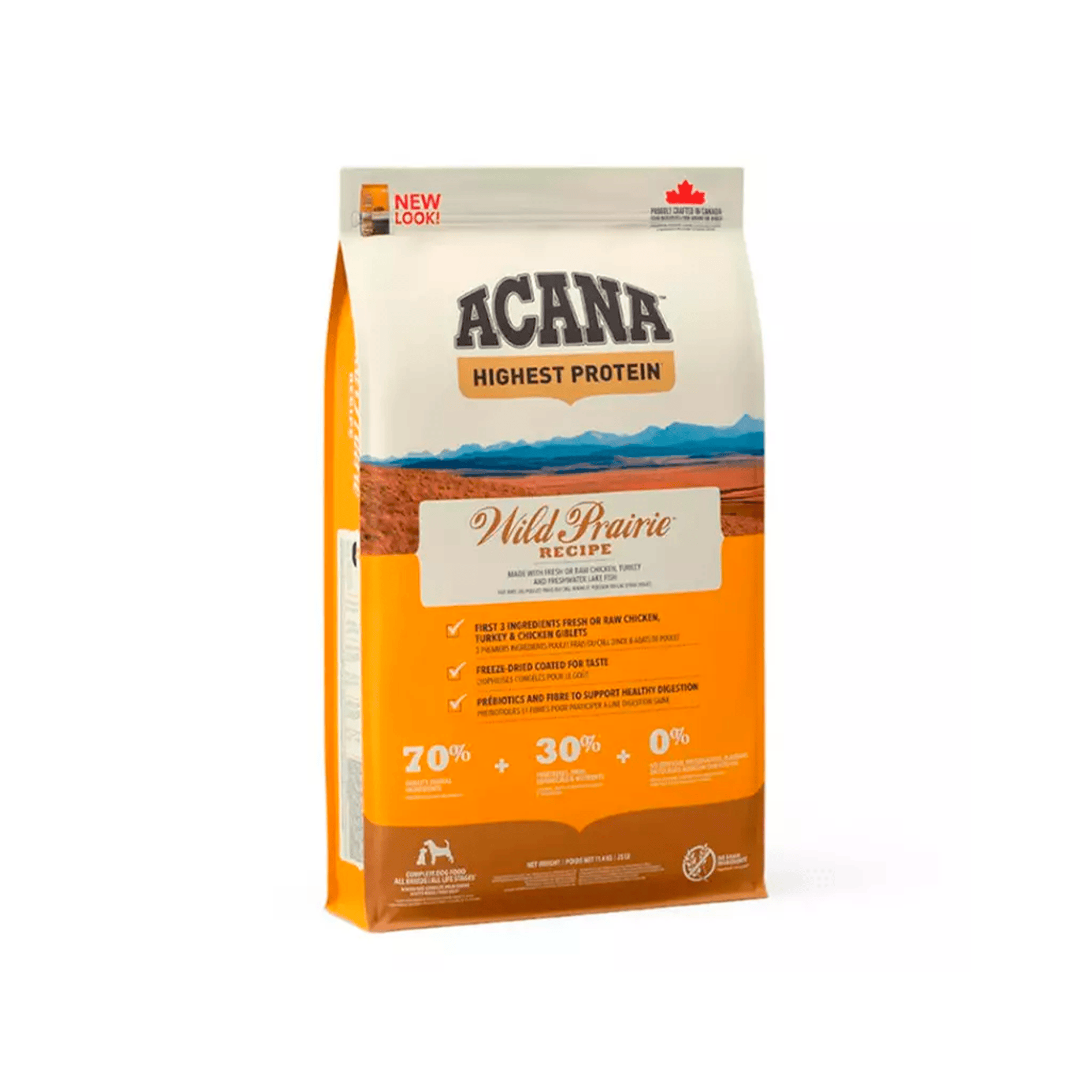 Fabricado con un 60% de nutritivo pollo, huevos y pescado, ACANA Wild Prairiecoincide con la adaptación evolutiva de su perro a una dieta de carne, rica en proteínas y gran variedad de carnes, frescas de la zona, que reflejan la diversidad de la dieta natural de su perro.