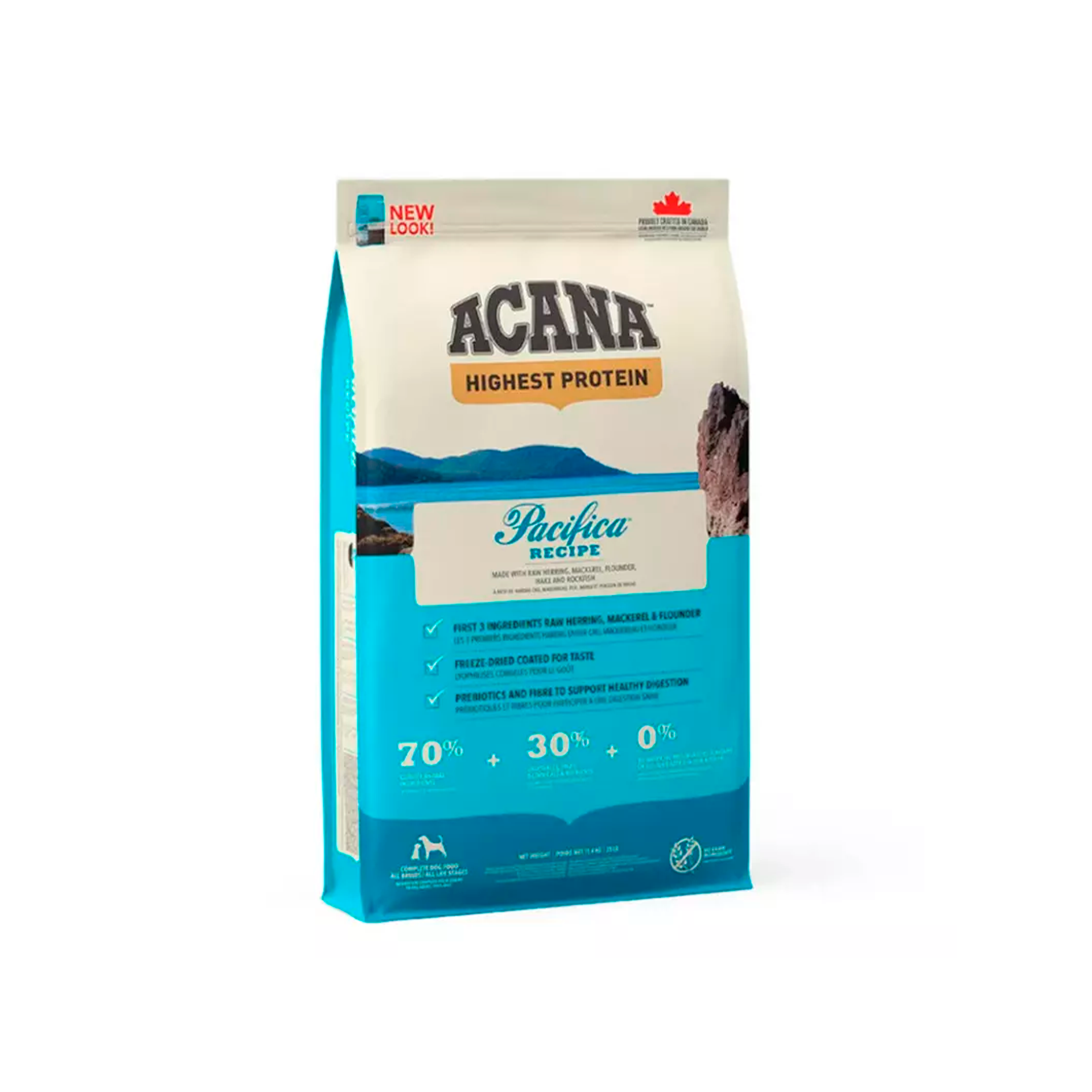 ACANA Pacifica está repleto de pescado canadiense fresco, de hábitat natural y pesca sostenible, capturado al norte de la Isla de Vancouver: arenque, sardina, platija, merluza y pez roca. ACANA Pacifica contiene un 70% de pescado. La MITAD del pescado en ACANA es FRESCO y ENTERO y la otra MITAD es seco o con aceites. Todo el pescado está considerado apto para el consumo humano.