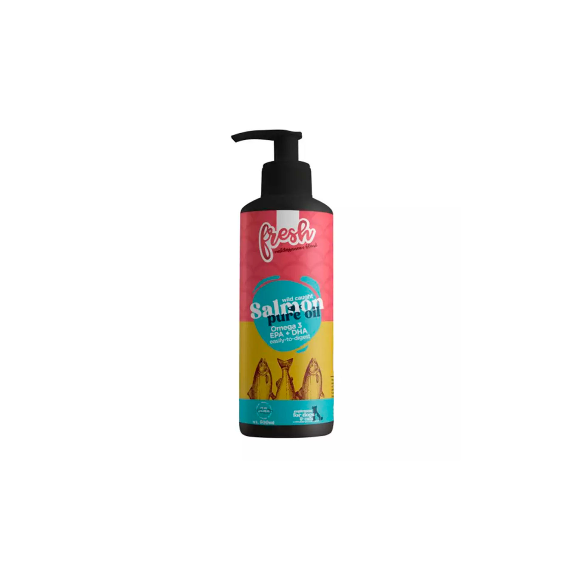 El Aceite de Salmón Fresh es un suplemento natural de alta calidad para perros y gatos, elaborado exclusivamente con salmón prensado en frío. Su perfil nutricional es rico en ácidos grasos Omega-3, especialmente EPA y DHA, esenciales para reforzar la salud general de tu mascota.