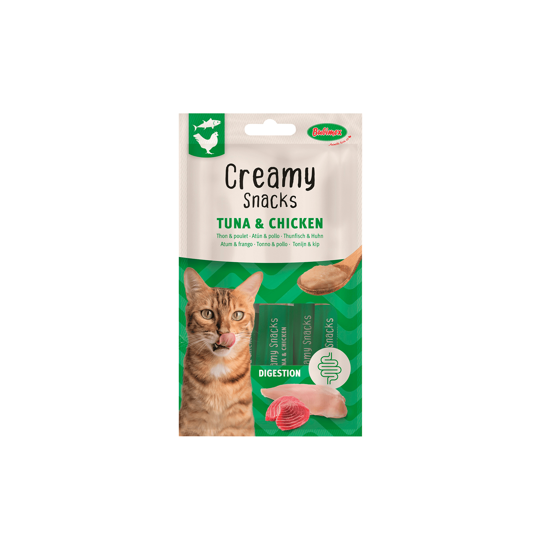 Alimento complementario para gatos. Perfectos para recompensar a su gato, los snacks cremosos Bubimex son ligeros e hidratantes, gracias a su textura cremosa, pueden lamerse fácilmente directamente del envase. Además, la raíz de achicoria, gracias a su efecto prebiótico, contribuye a una mejor salud intestinal y una digestión más eficiente.