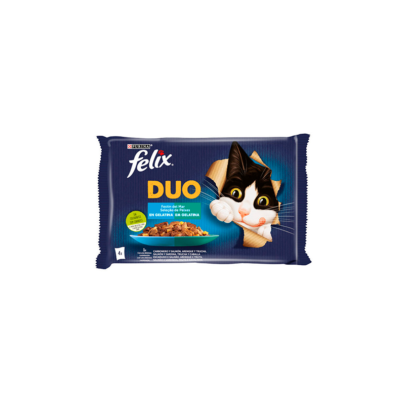 El Alimento Felix Duo Festín del Mar en Gelatina es una opción deliciosa y nutritiva para gatos adultos, que combina el mejor sabor del mar con una textura suave en gelatina, ¡perfecta para los felinos más exigentes!