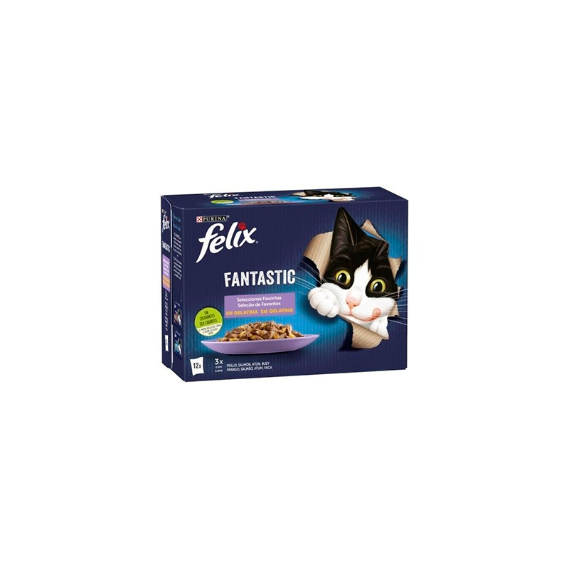 Felix Fantastic Selecciones Favoritas está compuesto por 12 sobres de 100grs cada uno con buey, pollo, salmón y atún (La presentación está compuesta por 3 sobres de cada sabor)