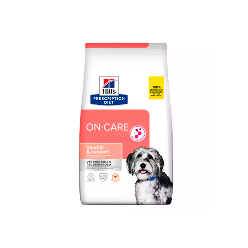 Nutricionistas y veterinarios de Hills han creado Hill’s Prescription Diet ON-Care para nutrir y apoyar específicamente a los perros que luchan contra enfermedades graves. Este delicioso alimento seco está elaborado con pollo, grasas sabrosas y una proteína altamente digestible para brindar a tu perro una experiencia excelente durante la hora de la comida.