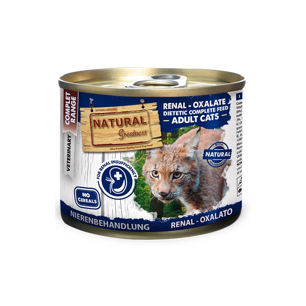 | Natural Greatness Renal-Oxalate es un alimento húmedo, completo, hipoalergénico y sin cereales formulado para gatos júnior y adultos con problemas de insuficiencia renal crónica (IRC) que necesitan una dieta basada en una alimentación con aportes restringidos de proteínas y fósforo. Renal Care contribuye a la preservación de la función renal y a la reducción de la reaparición de cálculos de oxalato.