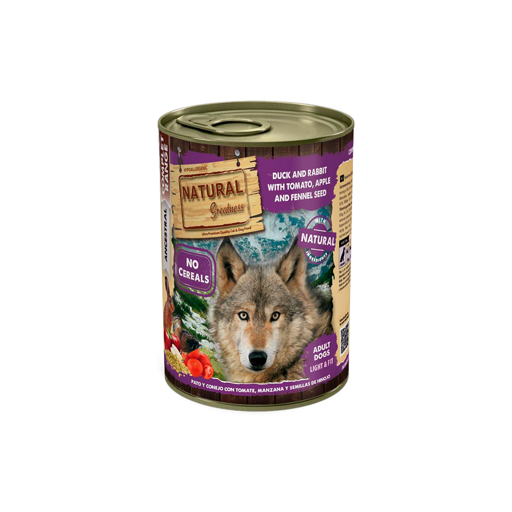 | Receta light para perros adultos con una mezcla de carnes bajas en grasas: la carne de pato y la carne de conejo.. La manzana es una fuente de vitamina A y C con poderosos antioxidantes. Los tomates maduros son altos en fibra y una fuente importante de vitamina C, rica en antioxidantes naturales que ayudan a combatir el envejecimiento prematuro. Las semillas de hinojo ayudan a regular el sistema digestivo del perro y aportan numerosos nutrientes como el magnesio, la vitamina C, la vitamina B3, la fibra, el potasio y el manganeso.