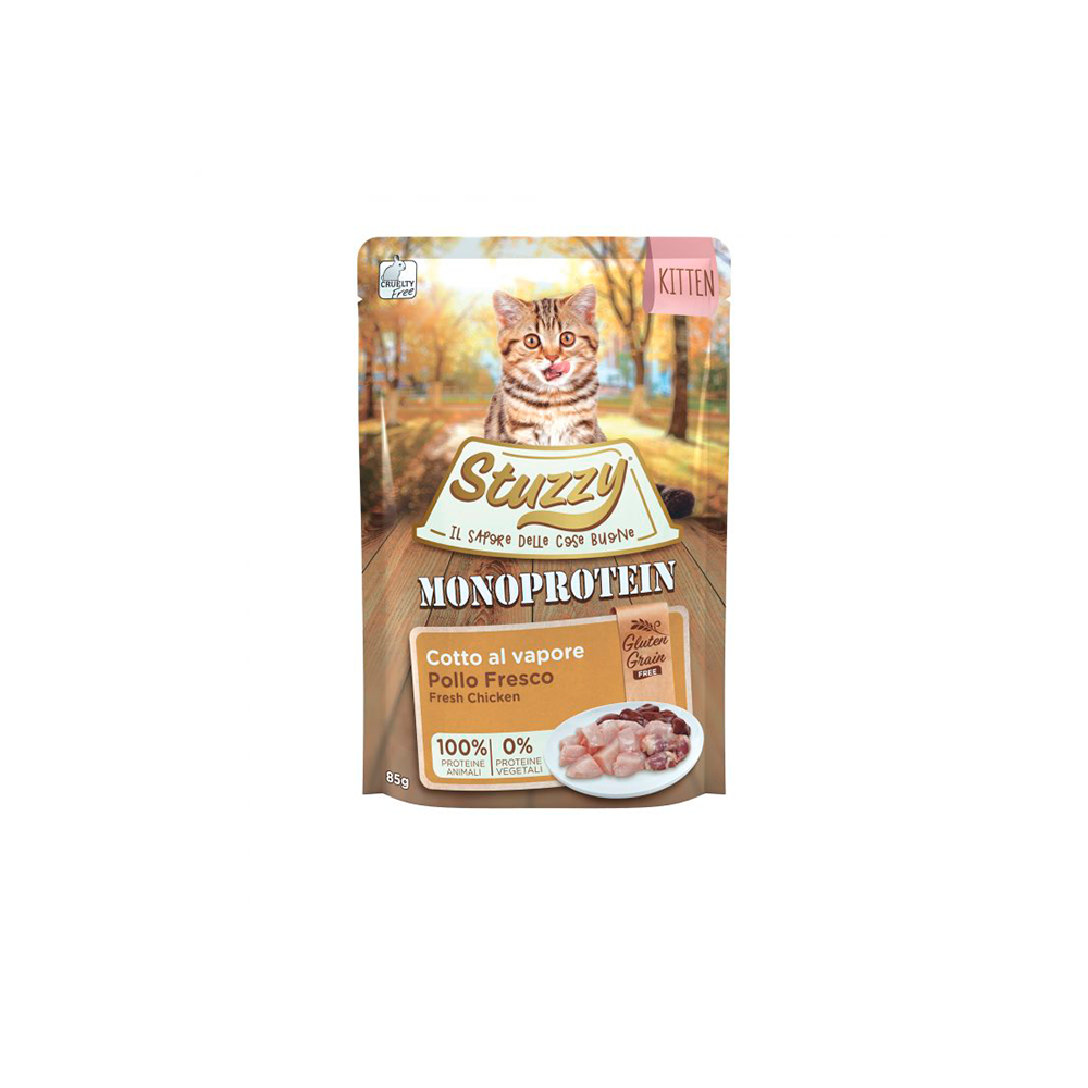 No contiene cereales ni gluten. Monoproteica gracias a la presencia de una sola fuente de proteínas de animales. Rica en proteínas de elevado valor biológico y por lo tanto fácil de digerir. Se prepara con ingredientes naturales y no contiene hormonas, antibióticos, colorantes ni conservantes añadidos.