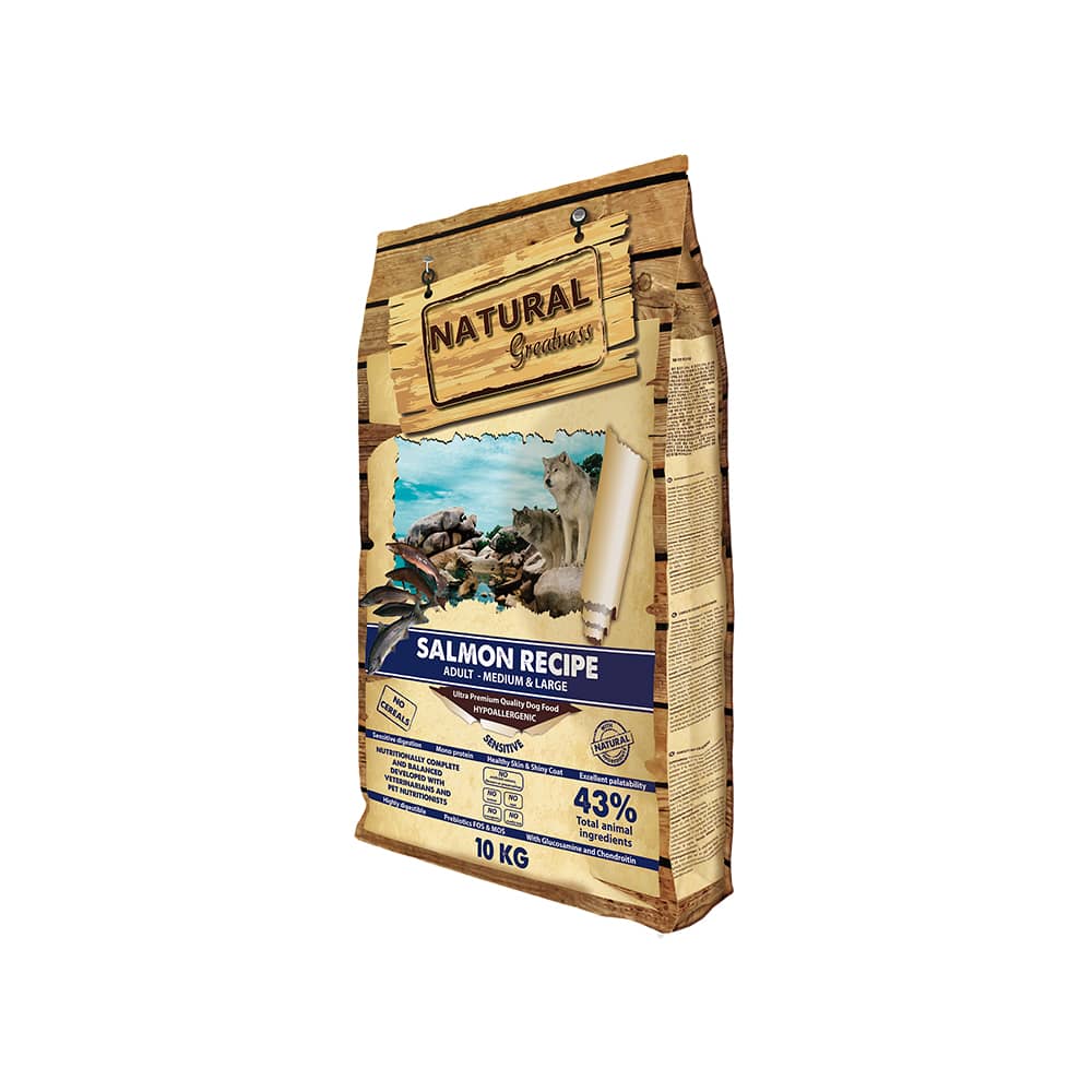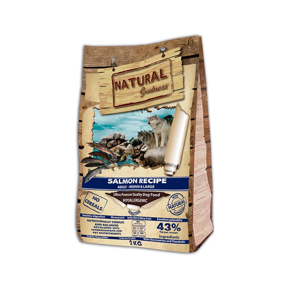 Excelente receta ultra premium e hipoalergénica formulada sin cereales y desarrollada idealmente para perros adultos con sensibilidad al pollo u otras carnes o para aquellos que, simplemente, requieren una alimentación de alta calidad. Esta receta monoproteica de salmón posee una alta concentración de ácidos grasos omega 3 y 6, que favorecen el buen funcionamiento del sistema inmunitario del perro y mejoran su tránsito intestinal y la salud de su piel y su pelaje. Toda nuestra alimentación se elabora siguiendo un proceso natural de cocción altamente avanzado que se basa en la inyección directa de carne fresca. La calidad de los ingredientes naturales empleados