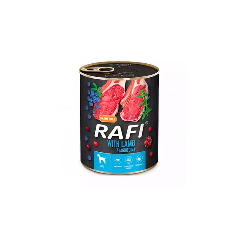 Elige Rafi Húmedo con Cordero y Arándanos y ofrece a tu perro una experiencia alimenticia completa, natural y deliciosa.