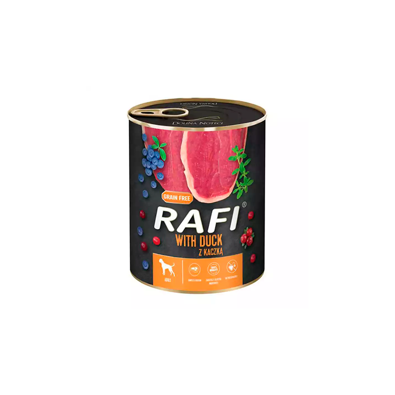 Rafi húmedo con carne de pato y arándanos es un alimento completo diseñado para cubrir las necesidades nutricionales de perros adultos de todas las razas. Rico en proteínas de alta calidad y nutrientes esenciales, este alimento sin cereales favorece una dieta equilibrada y saludable.