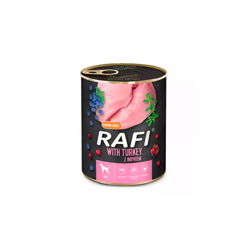 Con Rafi Comida Húmeda de Pavo y Arándanos, tu perro disfrutará de una dieta sabrosa y saludable todos los días, libre de cereales y rica en nutrientes esenciales.