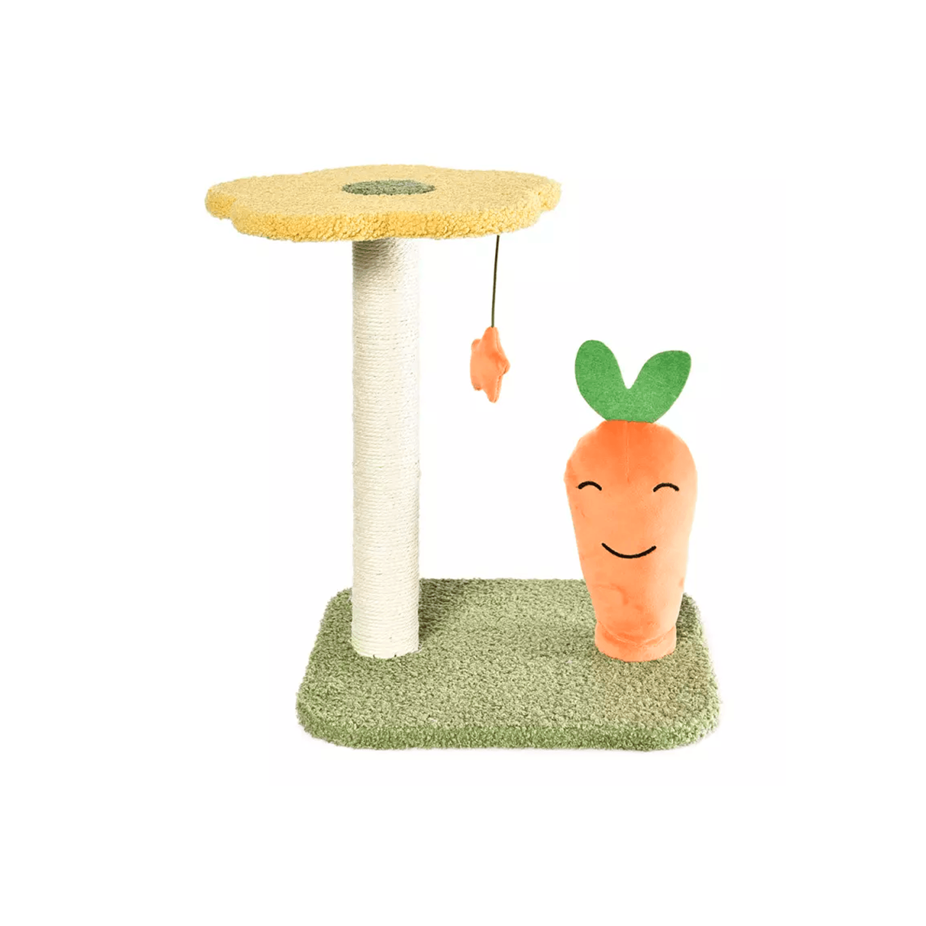 Su estructura compacta (43 cm alto × 34 cm ancho × 35 cm largo) incluye una plataforma elevada para descansar, un juguete colgante para estimular el juego y una adorable zanahoria de peluche que añade un toque lúdico. Ideal para espacios pequeños, este rascador multicolor es perfecto para gatos curiosos que buscan un lugar cómodo para rascar, jugar y relajarse.