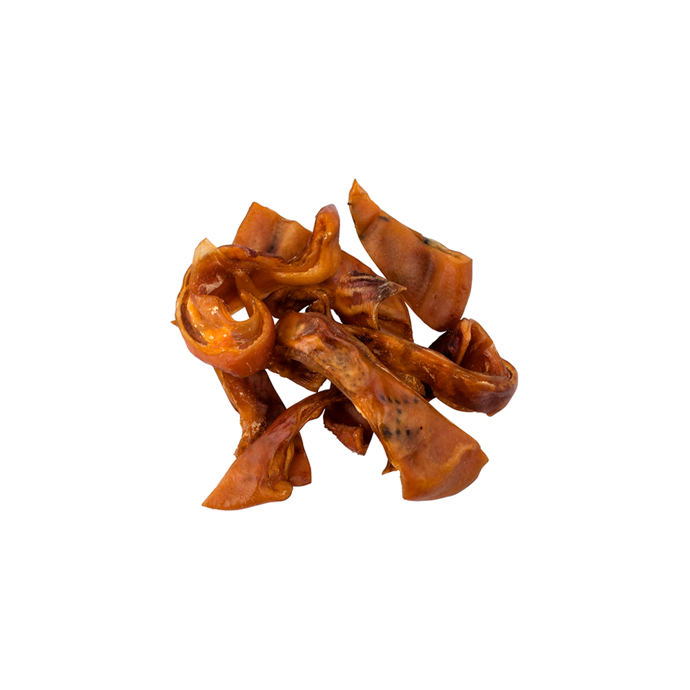 Snack natural de tiras de oreja de cerdo deshidratada para perros.