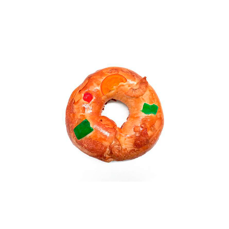 Este Roscón de Reyes se presenta en un atractivo formato circular, con una textura suave y esponjosa que invita a ser probado. Sus colores naturales, que varían entre tonos dorados y frutales, destacando la calidad de los ingredientes.