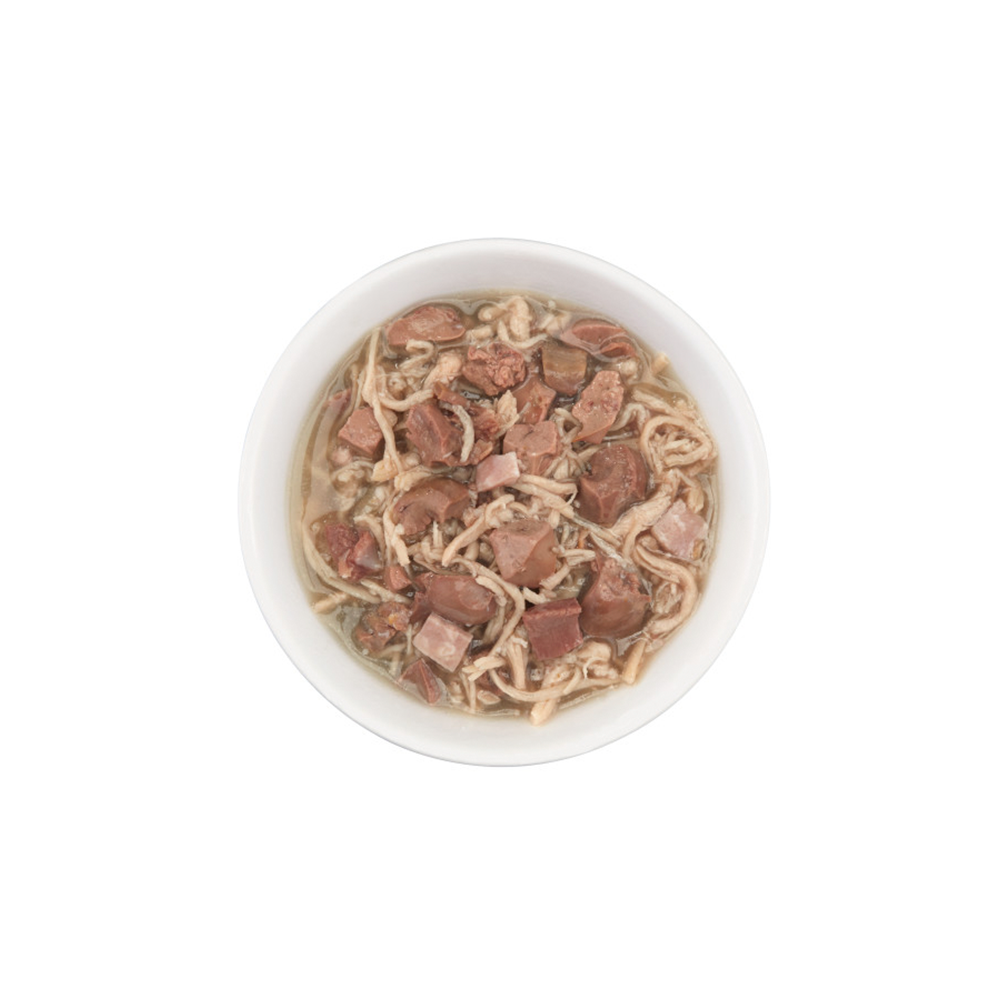 Cada receta está formulada con proteínas de alta calidad, vitaminas esenciales y minerales, garantizando una dieta integral. La combinación de tiernos filetes de pollo y órganos reales en un caldo rico y nutritivo proporciona una experiencia culinaria excepcional, al tiempo que asegura la hidratación óptima. Los ingredientes son seleccionados cuidadosamente y procesados mínimamente para preservar su valor nutricional superior, ofreciendo así lo mejor para la salud y el bienestar de su gato.