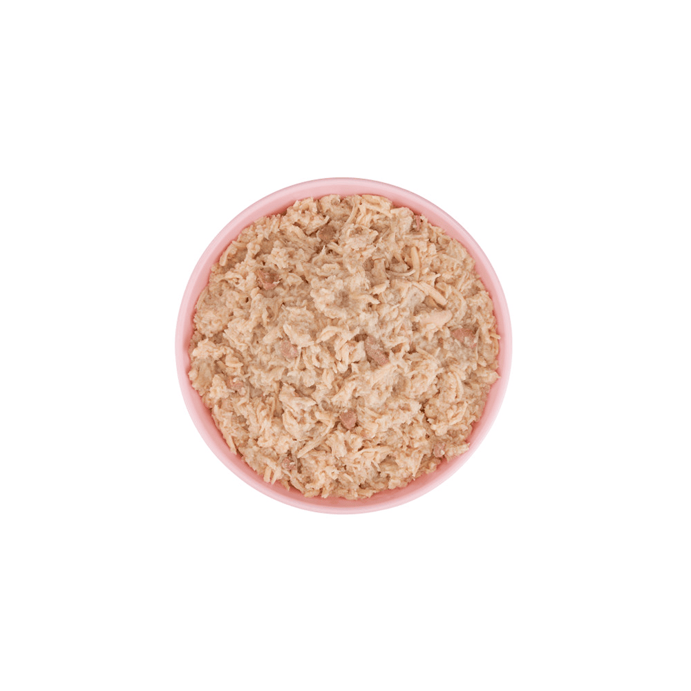pollo 63%, caldo de pollo 18%, aceite de girasol refinado, hígado de pollo 4%, salmón 4%, almidón de tapioca, minerales, inulina de achicoria, aceite de salmón.