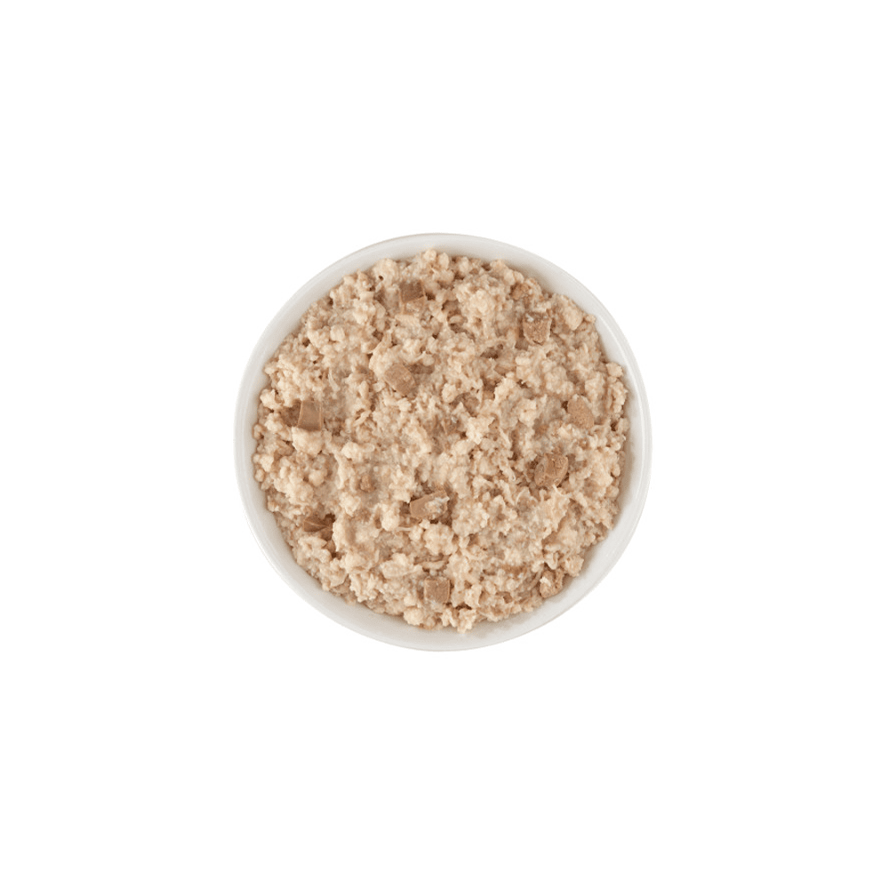 pollo 63%, caldo de pollo 18%, aceite de girasol refinado, hígado de pollo 4%, huevos, almidón de tapioca, minerales, inulina de achicoria, aceite de salmón.