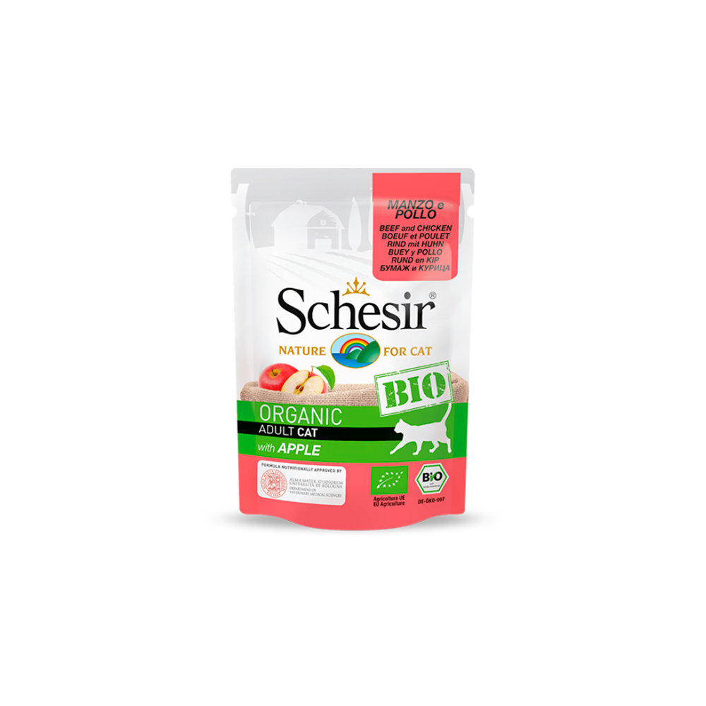 Sobres schesir bio gato sabor buey y pollo con manzana