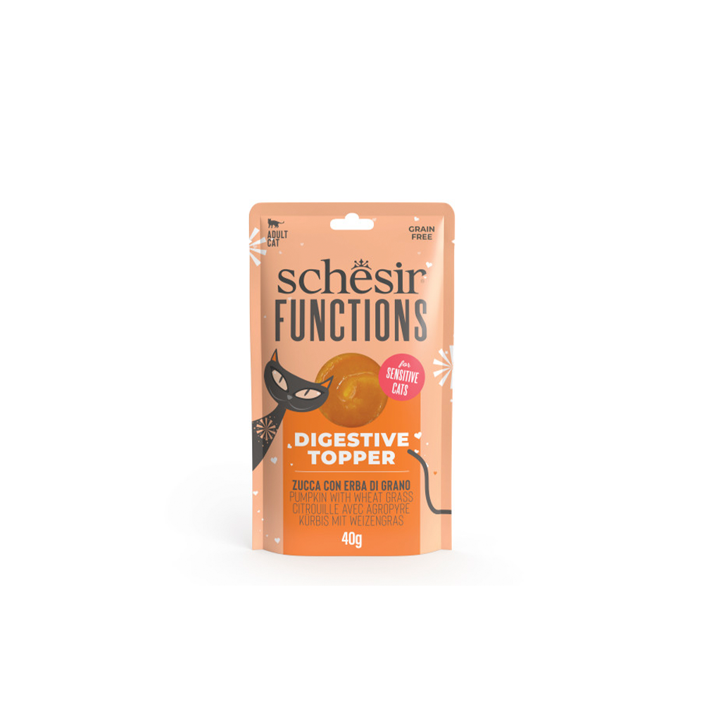 Schesir ha lanzado una línea de recetas funcionales entre las que se encuentra este delicioso topper de agradable textura que ayudará a aumentar la hidratación del alimento seco y a prevenir los problemas digestivos. Entre sus ingredientes encontramos la calabaza y la hierba de trigo, que contribuyen a una digestión saludable y alivian problemas estomacales sensibles aportando un extra de fibra tan necesario en gatos mayores o con poca actividad. Es un alimento complementario y grain free. Se lo podrás servir sólo o como complemento adicional a su dieta habitual o solo.
