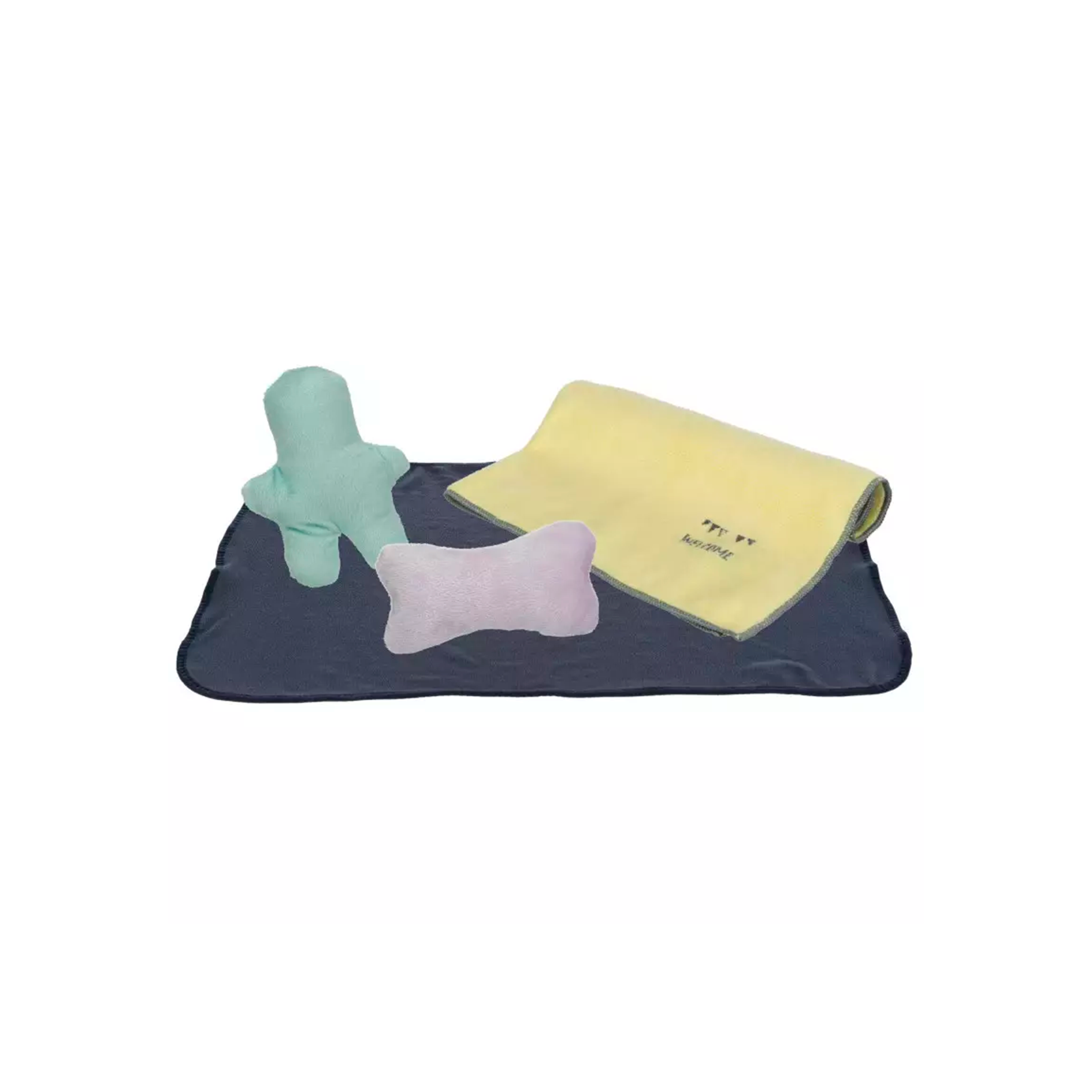 Este set para cachorros incluye Manta, toalla y juguetes.