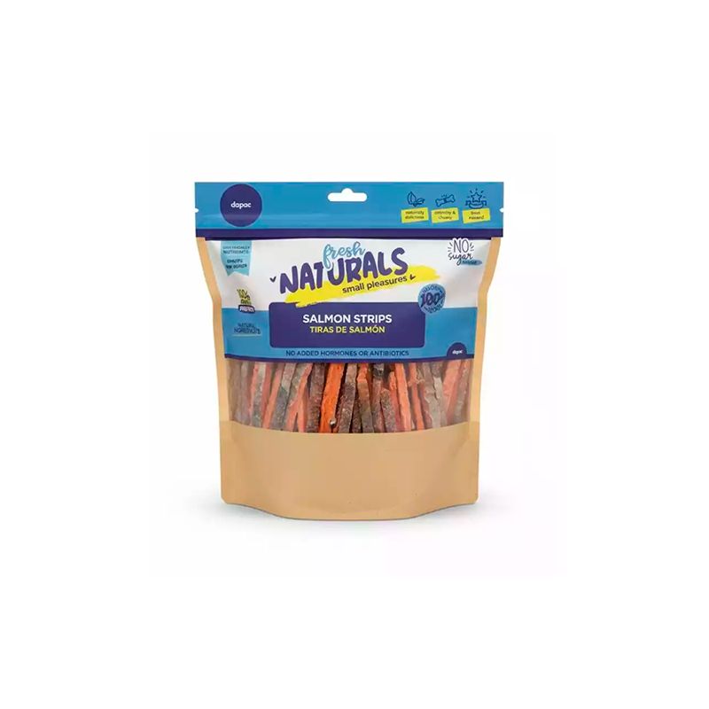 Las Snack Fresh Naturals Tiras de Salmón para Perros son una opción premium diseñada para ofrecer una recompensa saludable, nutritiva y altamente palatable. Elaboradas con salmón como ingrediente principal, estas tiras aportan un elevado contenido en proteína bruta, ideal para complementar la alimentación diaria de tu perro.