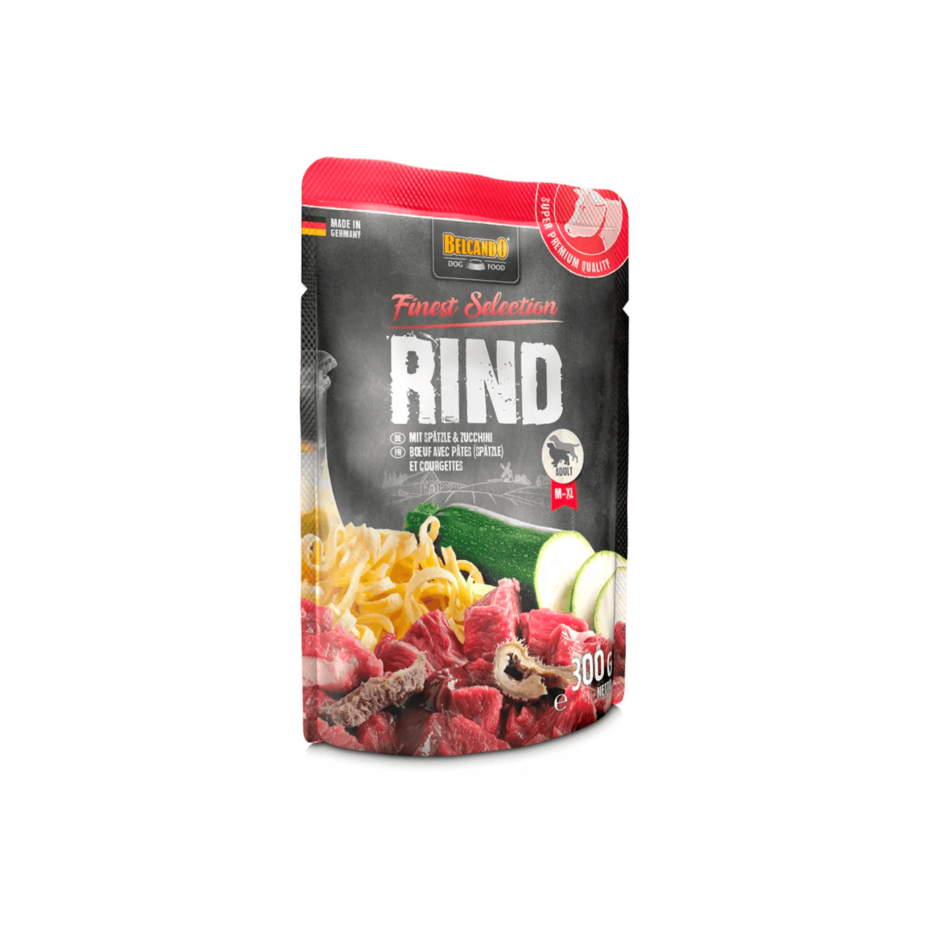 Para pequeños gourmets: Carne de vacuno jugosa y de alta calidad se combina con pasta al huevo, que absorbe los jugos de la carne, ofreciendo una experiencia de sabor única. Con la adición de calabacines, esta comida se convierte en una opción nutritiva, fácil de digerir y perfecta para perros sensibles o exigentes. Otro punto destacado de BELCANDO Finest Selection: un pelaje suave y brillante gracias a la adición de aceite de cártamo.