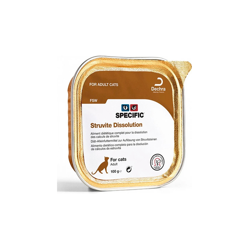 La comida húmeda veterinaria SPECIFIC FSW Struvite Dissolution es un alimento terapéutico completo indicado para gatos adultos y gatos mayores con cálculos de estruvita o enfermedades del tracto urinario bajo. El alimento presenta un contenido reducido en magnesio y en fósforo ( componentes de los cristales de estruvita), para la disolución de los cálculos de estruvita y las reducción de las recaídas.