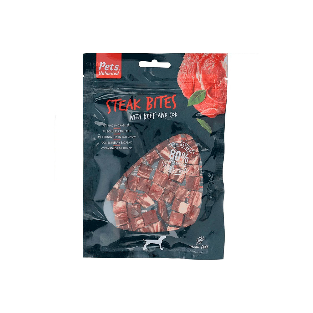 Steak bites son unos deliciosos y suaves snacks con una alta proporción de carne de vacuno y bacalao. Este tierno snack es ideal para el adiestramiento o como recompensa y es una verdadera delicia para los perros.