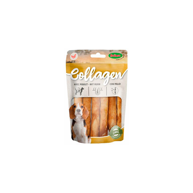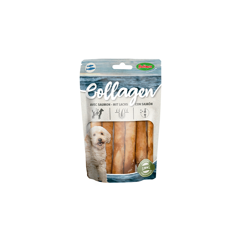 Sticks de salmón o pollo para perros Collagen son unos snacks muy saludables, ricos en colágeno, y adecuados para perros de razas medianas y grandes. Son un snack irresistible, elaborados con salmón , pollo y gelatina de vacuno (rica fuente de colágeno). Sin conservantes ni colorantes, son una alternativa a otras golosinas y un excelente complemento alimenticio que además, le aporta mucho placer a tu peludo. El colágeno es reconocido como un componente esencial para mantener la salud de las articulaciones y una piel sana y un pelo brillante y sedoso.