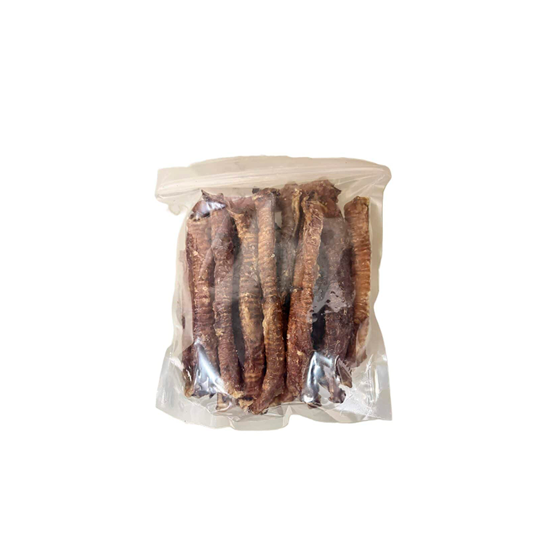 Las tráqueas de cerdo son un snack natural rico en colágeno, ideal para perros de todos los tamaños, especialmente cachorros y razas pequeñas o toy. No contienen hueso, pero aportan glucosamina y condroitina de forma natural, actuando como condroprotectores si se consumen de forma regular. Su formato estrecho y alargado las hace perfectas para que los cachorros aprendan a masticar con seguridad. Además, son una opción de masticación rápida y saludable para cualquier perro.