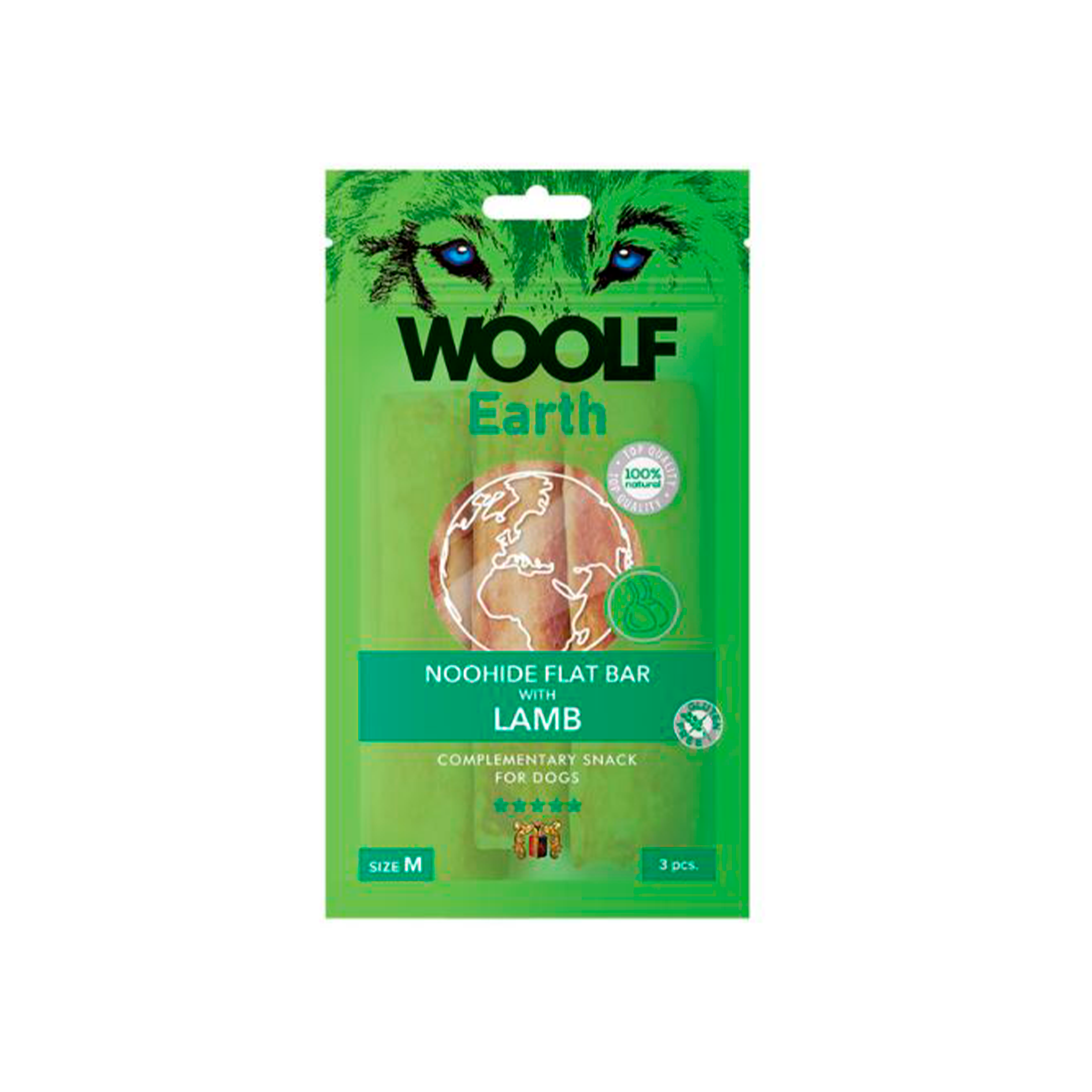 Woolf Earth con cordero, snacks sin cuero crudo para perros. Alimento complementario elaborado con ingredientes naturales de calidad. Los snacks Woolf Earth no contienen cereales, aditivos ni azúcares. No son tratados químicamente.